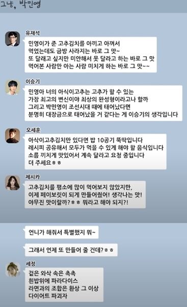 재료 손질부터 양념 준비까지 전 과정을 가감 없이 보여준 박민영은 고생 끝에 완성된 김치를 소분해 동료 연예인들에게 선물했는데요, 선물을 받은 유재석, 이승기, 엑소 세훈, 김세정, 제시카는 유쾌한 '주접 후기'로 화답했습니다.